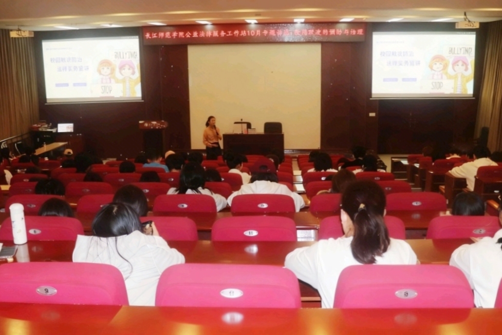 为增强同学们的法治意识与应对校园欺凌的能力,推动安全、和谐、法治的校园环境建设,10月17日下午14:30,我校公益法律服务工作站在玉衡学术报告厅开展“校园欺凌的预防与治理”主题讲座活动,本次讲座由学生工作处学生社区管理科汪明训老师主持,由重庆柯大律师事务所副主任周静主讲。