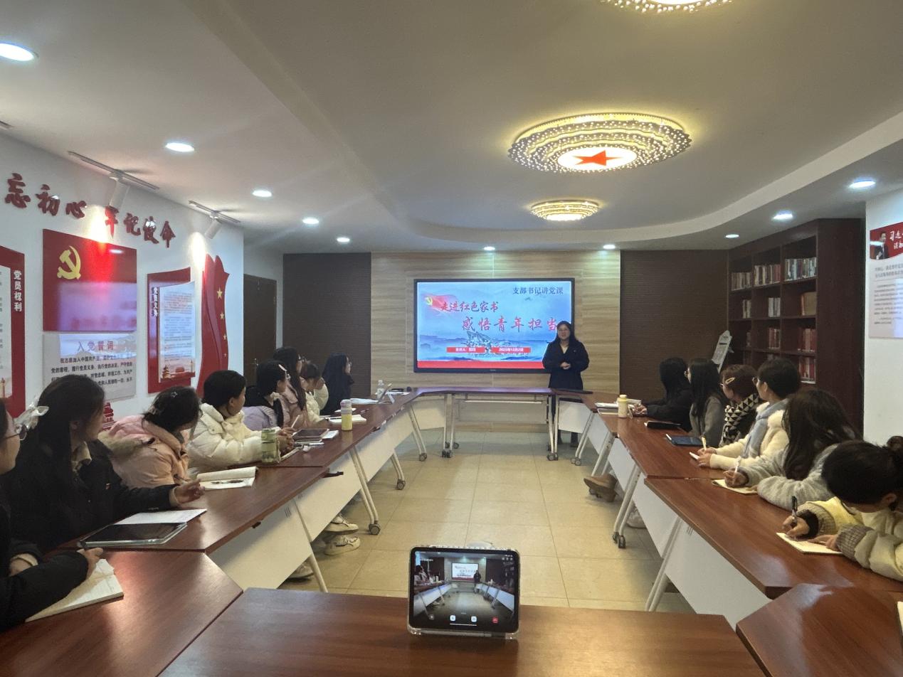 邓巧同志以《走进红色家书,感悟青年担当》为题接续开讲。她以“红色家书”为精神载体,构建起“走进家书—感悟内核—传承基因”的三维授课体系。通过生动讲述李征明的战地纪实、王尔琢的家国抉择、陈觉与赵云霄夫妇的生死绝恋等革命先辈的家书故事,带领党员们穿透历史硝烟,深刻体悟字里行间蕴含的坚定信仰、赤子情怀与革命气节。讲解中她倡导党员们将红色精神传承与专业能力提升相结合,通过创新翻译表达、参与志愿服务等方式,让红色故事在国际传播中焕发新的生命力。