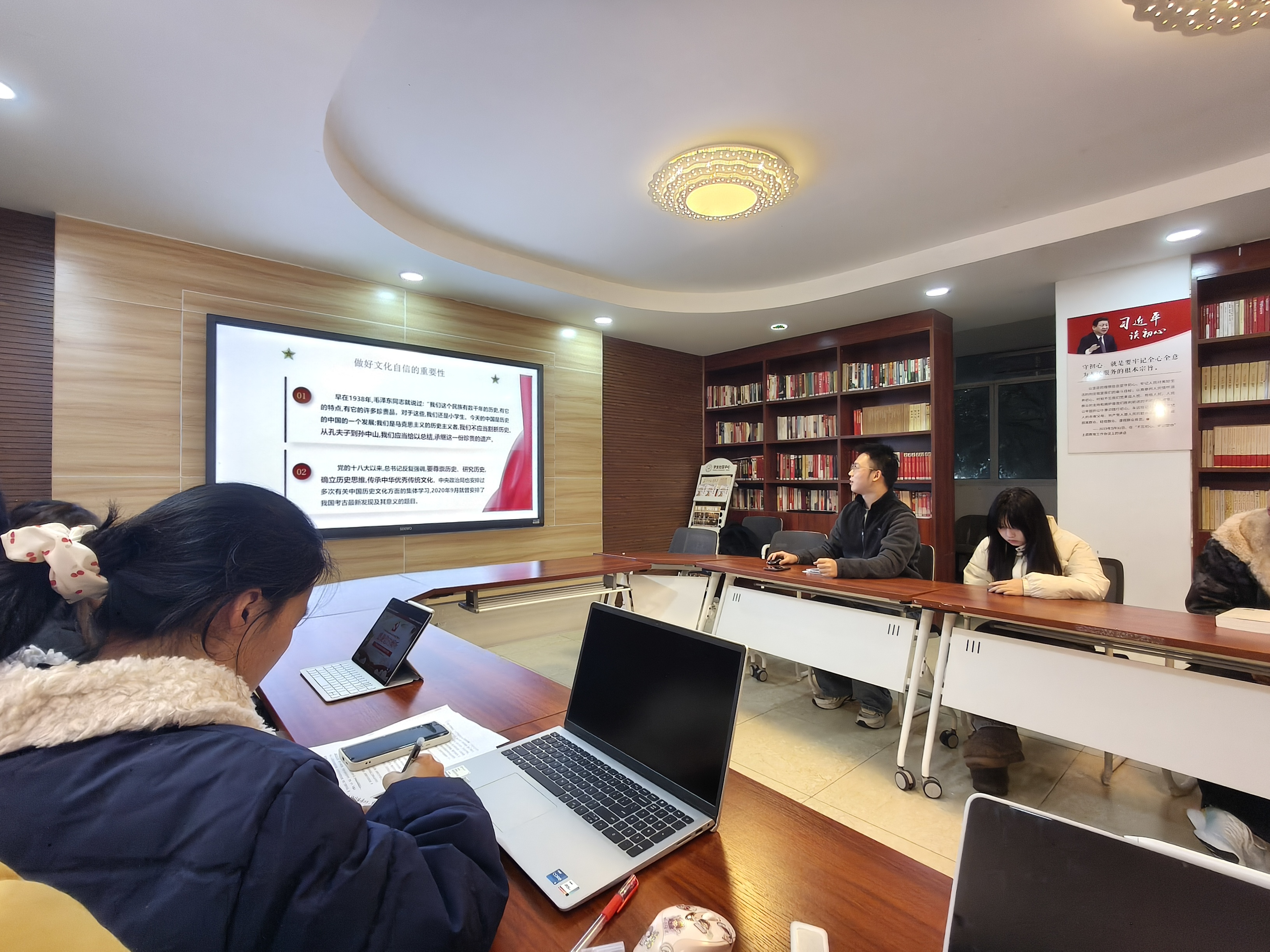 活动现场气氛热烈,成员们在会前已完成金句摘录与心得撰写,交流中既有理论深度,又贴近学习生活实际。大家一致表示,要将学习成果转化为行动自觉,在专业成长中融入家国情怀,在科技报国中彰显青年担当。